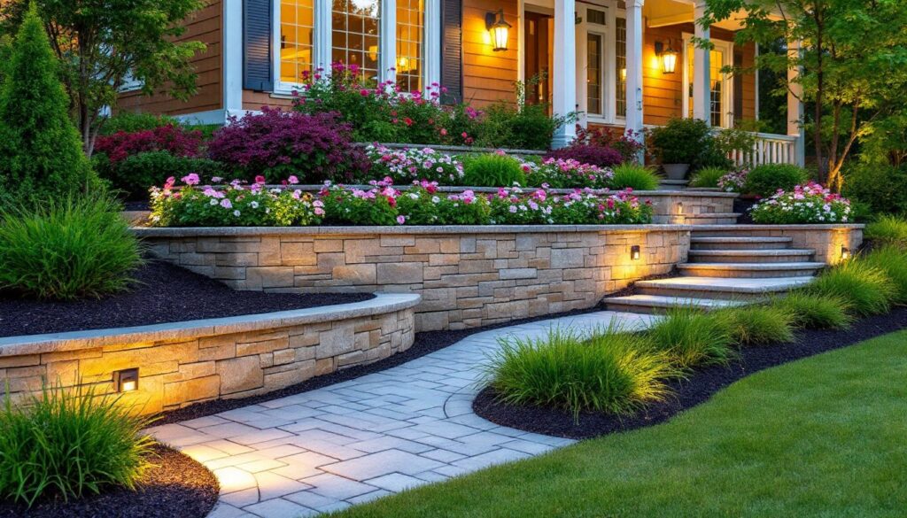 Tiered retaining walls create natural shelves for staggered planting, turning a slope into a lush focal point. This approach works especially well on lots with existing 4- to 6-foot elevation changes or where the homeowner wants to soften a single tall wall with multiple shorter sections.